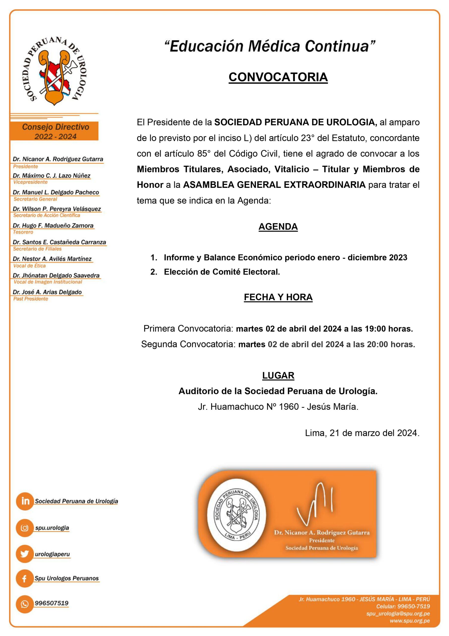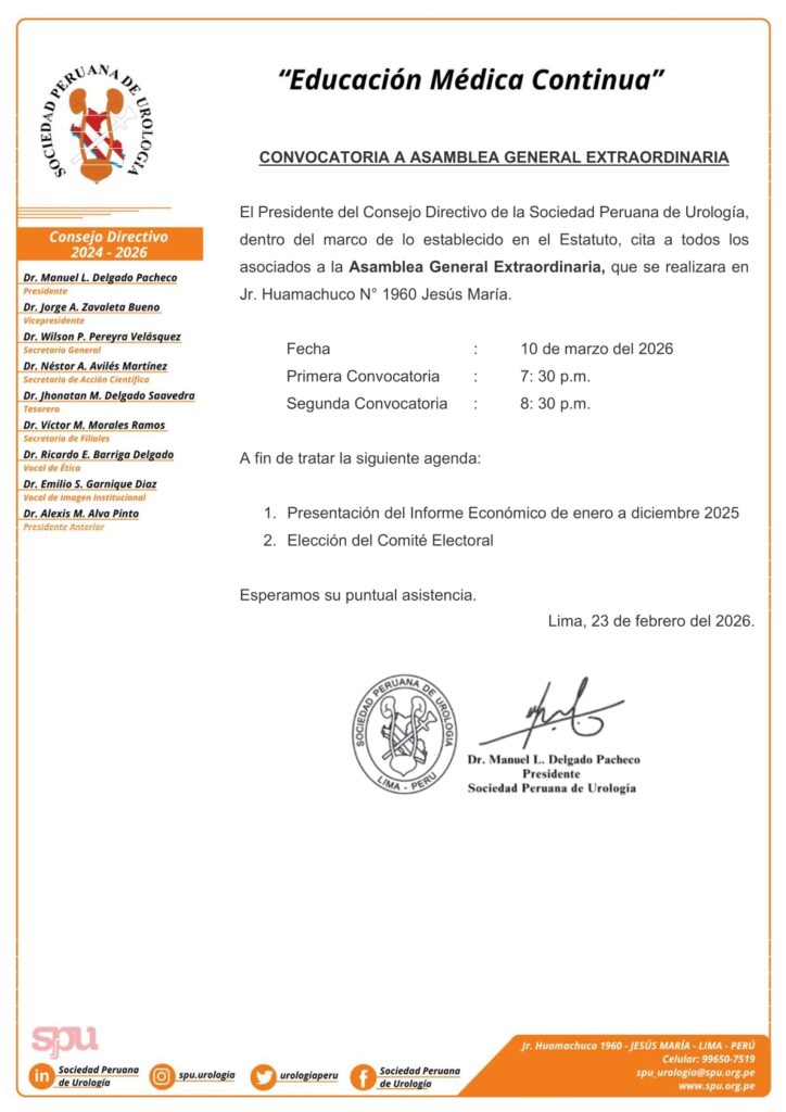 El Presidente del Consejo Directivo de la Sociedad Peruana de Urología, dentro del marco de lo establecido en el Estatuto, cita a todos los asociados a la Asamblea General Extraordinaria, que se realizara en Jr. Huamachuco N° 1960 Jesús María.